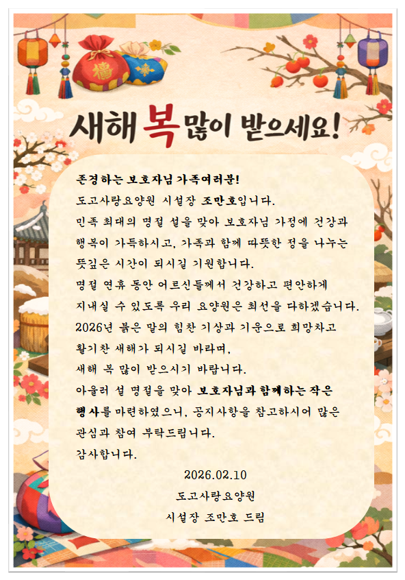 2026년 새해 복 많이 받으세요 페이지 정보 작성자 사랑요양원 조회 8회 작성일 26-02-17 16:57 본문 2026년 새해 복 많이 받으세요 목록 이전글2026년 설 맞이 행사 안내 26.02.17 다음글입소문의는 041-531-9939 25.11.05