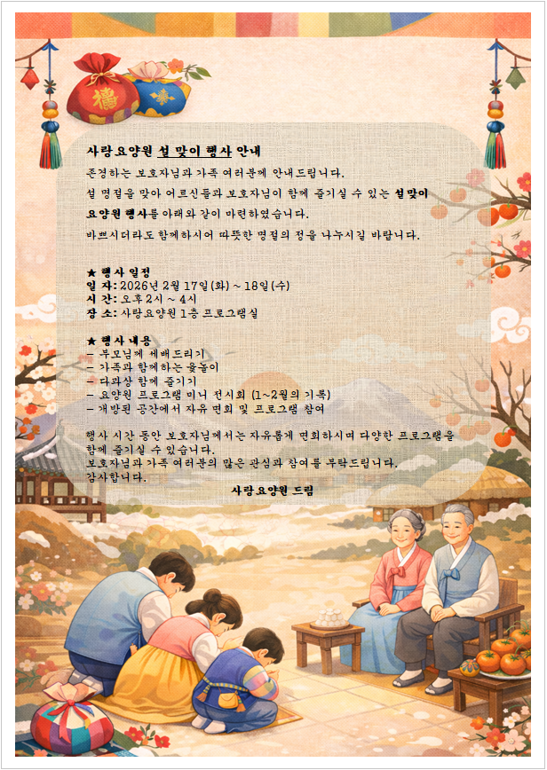 2026년 설 맞이 행사 안내 페이지 정보 작성자 사랑요양원 조회 6회 작성일 26-02-17 16:58 본문 많은 참여 바랍니다. 목록 다음글2026년 새해 복 많이 받으세요 26.02.17