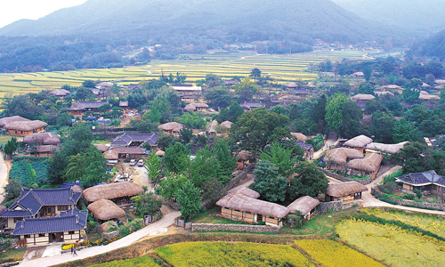 약 5백년 전에 이 마을에 정착한 예안 이씨 일가가 지금까지 주류를 이루어 살고 있는 민속마을 입니다. 마을 입구의 장승을 비롯하여 디딜방아, 연자방아, 물레방아, 초가지붕 등이 보존되어 있습니다.